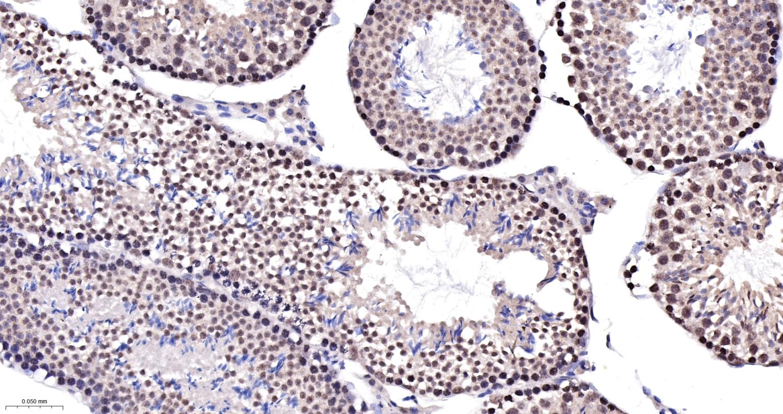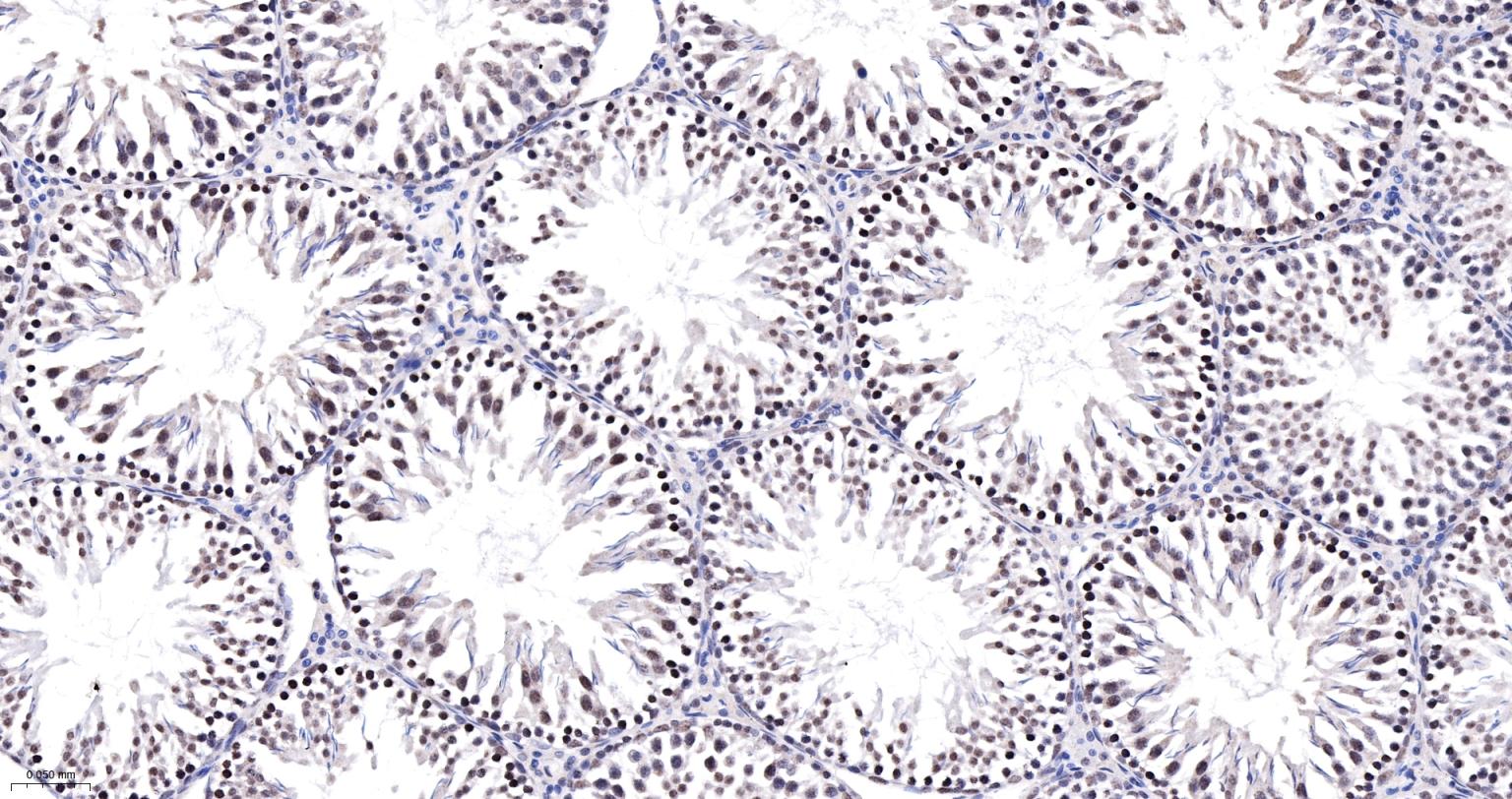 Paraformaldehyde-fixed, paraffin embedded Mouse Testicles; Antigen retrieval by boiling in sodium citrate buffer (pH6.0) for 15 min; The section was incubated with BAF53A Monoclonal Antibody, Unconjugated (bsm-61726R) at 1:200 overnight at 4°C, followed by conjugation to the bs-0295G-HRP and DAB (C-0010) staining.