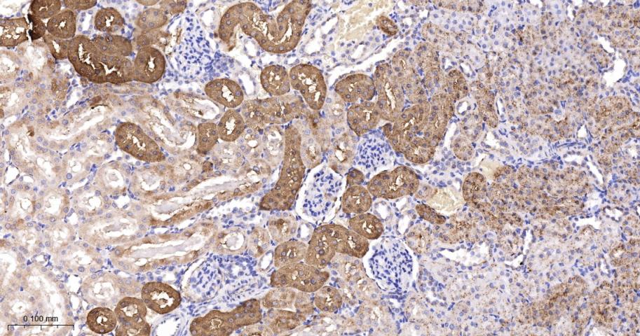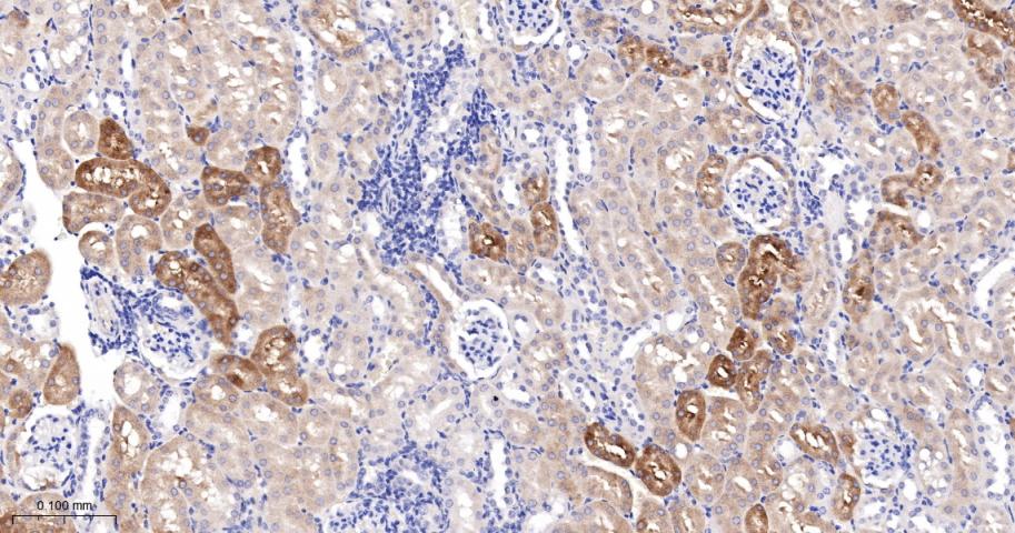 Paraformaldehyde-fixed, paraffin embedded Mouse Kidney; Antigen retrieval by boiling in sodium citrate buffer (pH6.0) for 15 min; The section was incubated with IGFBP7 Monoclonal Antibody, Unconjugated (bsm-61734R) at 1:200 overnight at 4°C, followed by conjugation to the bs-0295G-HRP and DAB (C-0010) staining.
