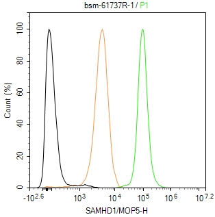 The Daudi (H) cells were fixed with 4% PFA (10 min at r.t.) and then permeabilized with 90% ice-cold methanol for 20 min at -20℃,the cells then were incubated in 5%BSA to block non-specific protein-protein interactions (30 min at r.t.), followed by secondary antibody incubation for 40 min at room temperature. Primary Antibody (green):Rabbit Anti-SAMHD1/MOP5 antibody (bsm-61737R,1:100); Isotype Control (orange): Rabbit IgG (bs-0295P). Blank control (black): PBS. Acquisition of 20,000 events was performed.