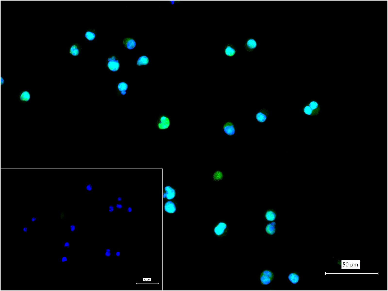 4% Paraformaldehyde-fixed Daudi (H) cell; Triton X-100 at r.t. for 20 min; Antibody incubation with (SAMHD1/MOP5) monoclonal Antibody, unconjugated (bsm-61737R) 1:100, 90 min at 37°C; followed by BF488 conjugated Goat Anti-Rabbit IgG antibody (green, bs-60295G-BF488) at 37°C for 90 min, DAPI (blue, C02-04002) was used to stain the cell nuclei. PBS instead of the primary antibody was used as the blank control.