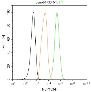The Hela (H) cells were fixed with 4% PFA (10 min at r.t.) and then permeabilized with 90% ice-cold methanol for 20 min at -20℃,the cells then were incubated in 5%BSA to block non-specific protein-protein interactions (30 min at r.t.), followed by secondary antibody incubation for 40 min at room temperature. Primary Antibody (green):Rabbit Anti-NUP153 antibody (bsm-61739R,1:100); Isotype Control (orange): Rabbit IgG (bs-0295P). Blank control (black): PBS. Acquisition of 20,000 events was performed.