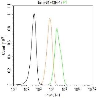 The HepG2 (H) cells were fixed with 4% PFA (10 min at r.t.) and then permeabilized with 90% ice-cold methanol for 20 min at -20℃,the cells then were incubated in 5%BSA to block non-specific protein-protein interactions (30 min at r.t.), followed by secondary antibody incubation for 40 min at room temperature. Primary Antibody (green):Rabbit Anti-PIWIL1 antibody (bsm-61743R,1:100); Isotype Control (orange): Rabbit IgG (bs-0295P). Blank control (black): PBS. Acquisition of 20,000 events was performed.