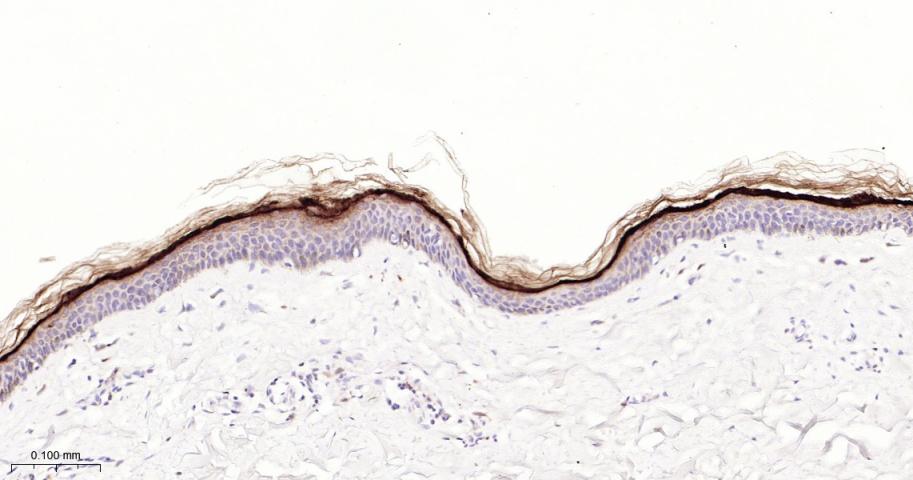 Paraformaldehyde-fixed, paraffin embedded Human Skin; Antigen retrieval by boiling in sodium citrate buffer (pH6.0) for 15 min; The section was incubated with LOR/Loricrin Monoclonal Antibody, Unconjugated (bsm-61744R) at 1:200 overnight at 4°C, followed by conjugation to the bs-0295G-HRP and DAB (C-0010) staining.