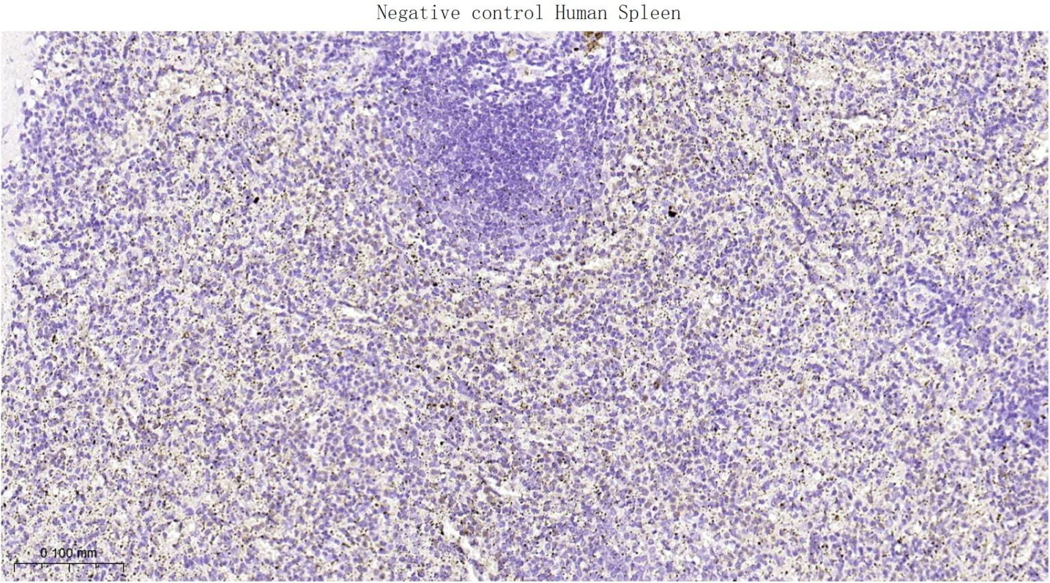 (Negative control)Paraformaldehyde-fixed, paraffin embedded Human Spleen; Antigen retrieval by boiling in sodium citrate buffer (pH6.0) for 15 min; The section was incubated with LOR/Loricrin Monoclonal Antibody, Unconjugated (bsm-61744R) at 1:200 overnight at 4°C, followed by conjugation to the bs-0295G-HRP and DAB (C-0010) staining.