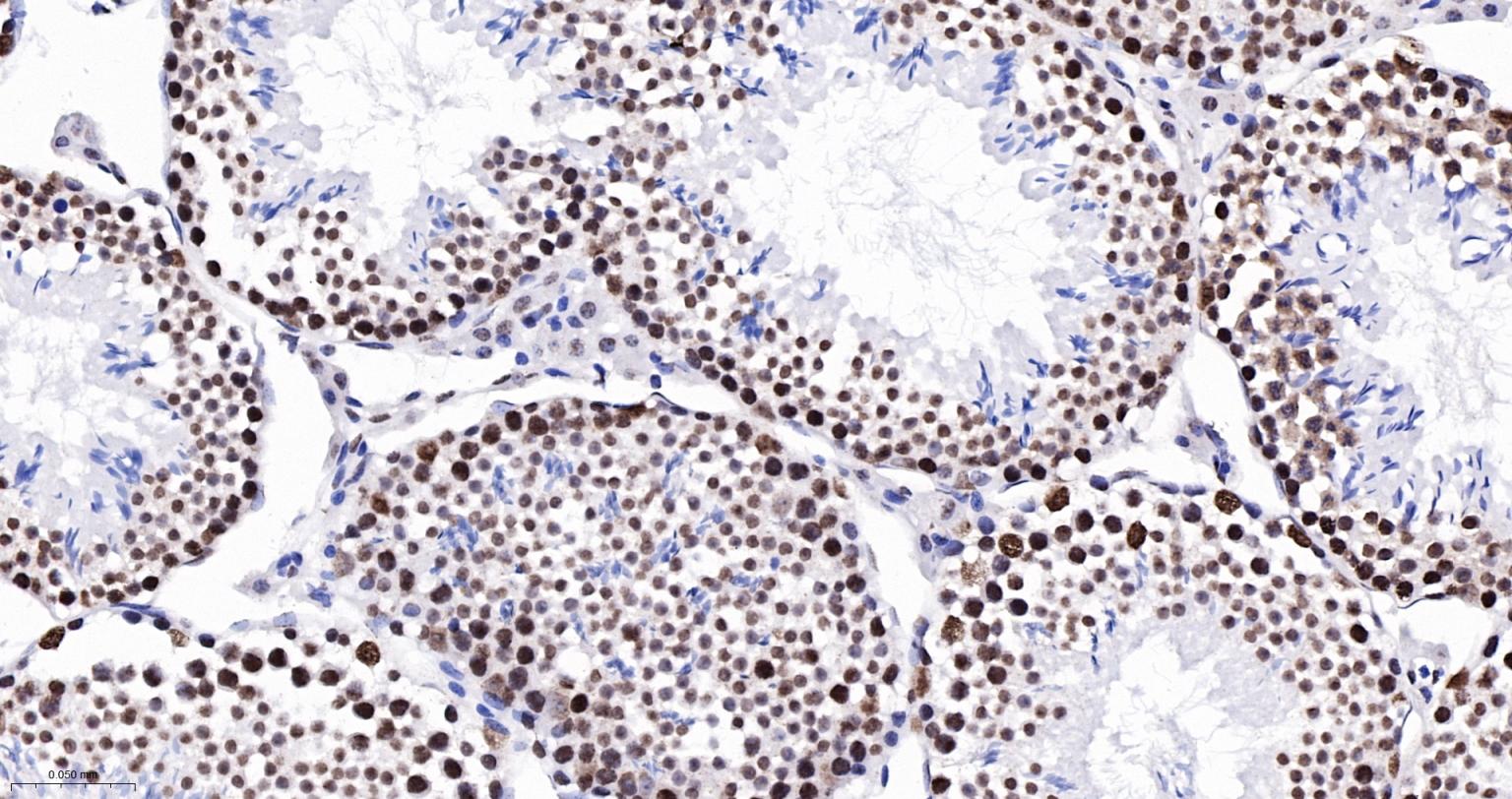 Paraformaldehyde-fixed, paraffin embedded Mouse Testicles; Antigen retrieval by boiling in sodium citrate buffer (pH6.0) for 15 min; The section was incubated with SFPQ Monoclonal Antibody, Unconjugated (bsm-61746R) at 1:200 overnight at 4°C, followed by conjugation to the bs-0295G-HRP and DAB (C-0010) staining.