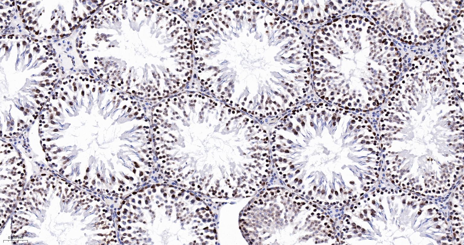Paraformaldehyde-fixed, paraffin embedded Rat Testicles; Antigen retrieval by boiling in sodium citrate buffer (pH6.0) for 15 min; The section was incubated with SFPQ Monoclonal Antibody, Unconjugated (bsm-61746R) at 1:200 overnight at 4°C, followed by conjugation to the bs-0295G-HRP and DAB (C-0010) staining.