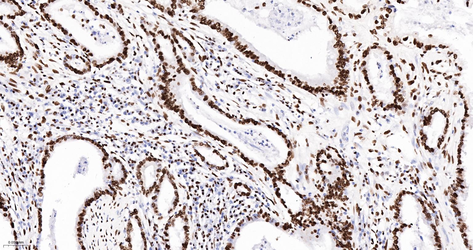 Paraformaldehyde-fixed, paraffin embedded Human Pancreatic Cancer; Antigen retrieval by boiling in sodium citrate buffer (pH6.0) for 15 min; The section was incubated with SFPQ Monoclonal Antibody, Unconjugated (bsm-61746R) at 1:200 overnight at 4°C, followed by conjugation to the bs-0295G-HRP and DAB (C-0010) staining.