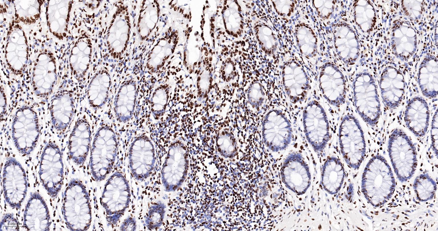 Paraformaldehyde-fixed, paraffin embedded Human Colon; Antigen retrieval by boiling in sodium citrate buffer (pH6.0) for 15 min; The section was incubated with SFPQ Monoclonal Antibody, Unconjugated (bsm-61746R) at 1:200 overnight at 4°C, followed by conjugation to the bs-0295G-HRP and DAB (C-0010) staining.