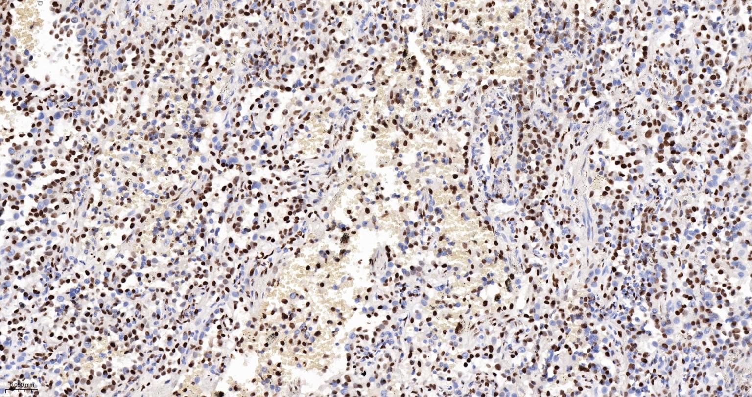 Paraformaldehyde-fixed, paraffin embedded Human Lung Cancer; Antigen retrieval by boiling in sodium citrate buffer (pH6.0) for 15 min; The section was incubated with SFPQ Monoclonal Antibody, Unconjugated (bsm-61746R) at 1:200 overnight at 4°C, followed by conjugation to the bs-0295G-HRP and DAB (C-0010) staining.