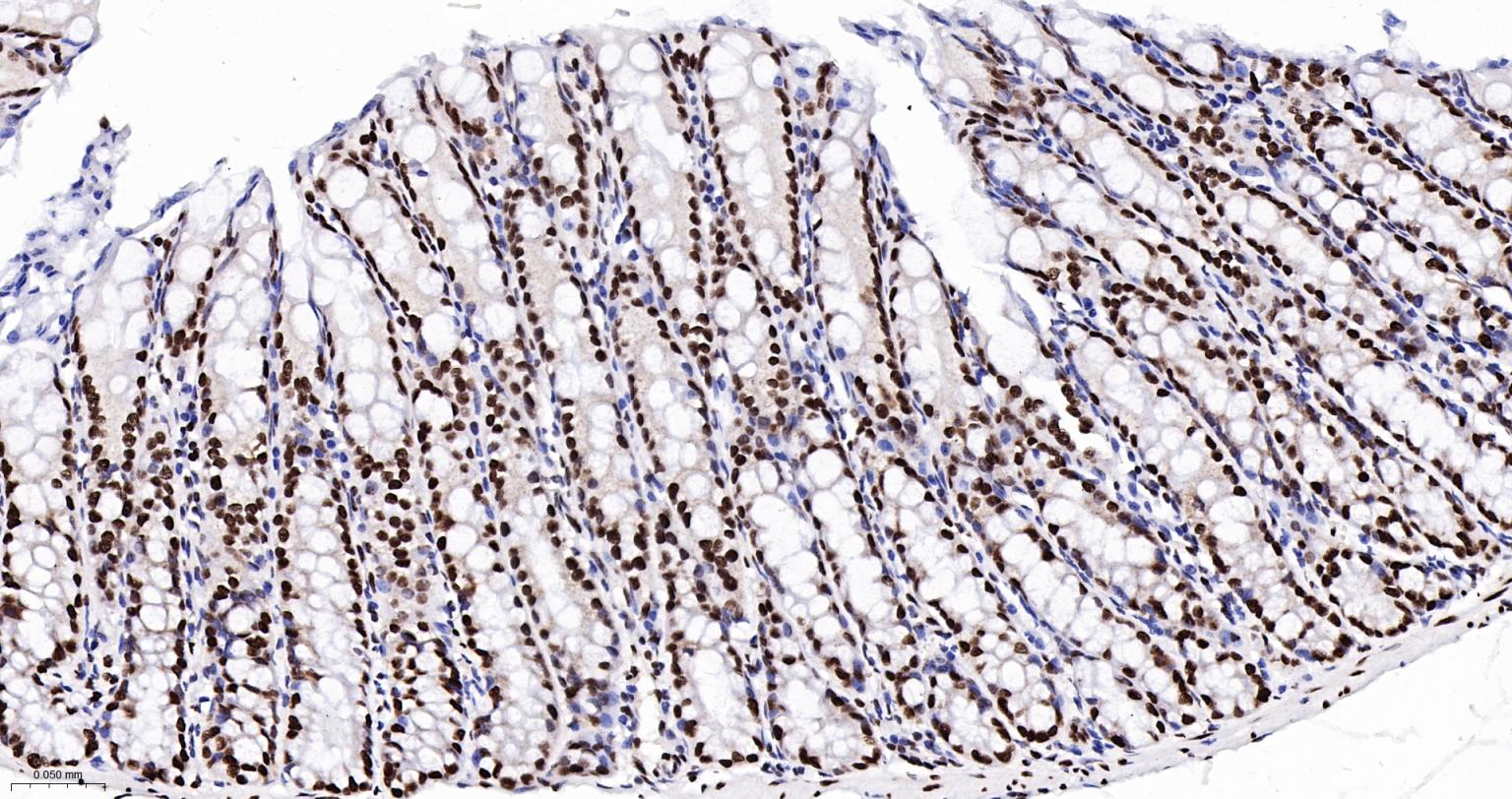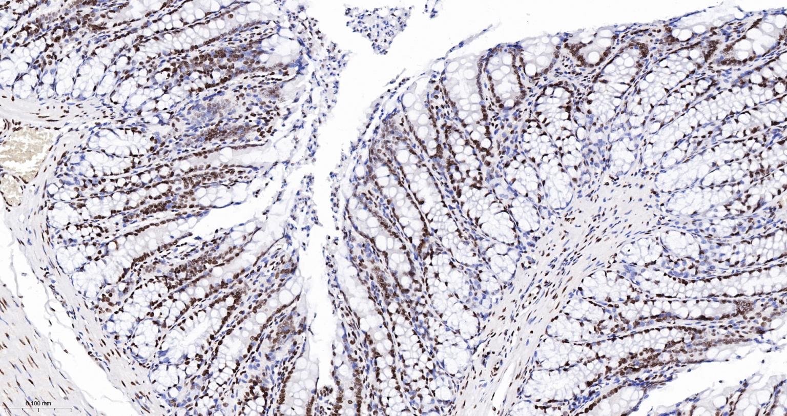 Paraformaldehyde-fixed, paraffin embedded Mouse Colon; Antigen retrieval by boiling in sodium citrate buffer (pH6.0) for 15 min; The section was incubated with SFPQ Monoclonal Antibody, Unconjugated (bsm-61746R) at 1:200 overnight at 4°C, followed by conjugation to the bs-0295G-HRP and DAB (C-0010) staining.
