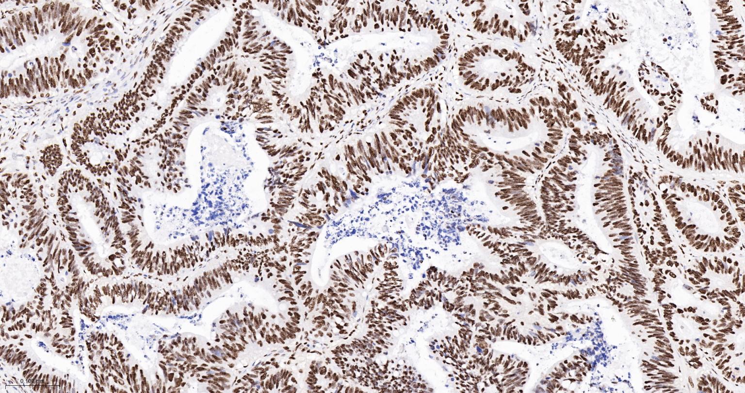 Paraformaldehyde-fixed, paraffin embedded Human Colon Cancer; Antigen retrieval by boiling in sodium citrate buffer (pH6.0) for 15 min; The section was incubated with SFPQ Monoclonal Antibody, Unconjugated (bsm-61746R) at 1:200 overnight at 4°C, followed by conjugation to the bs-0295G-HRP and DAB (C-0010) staining.
