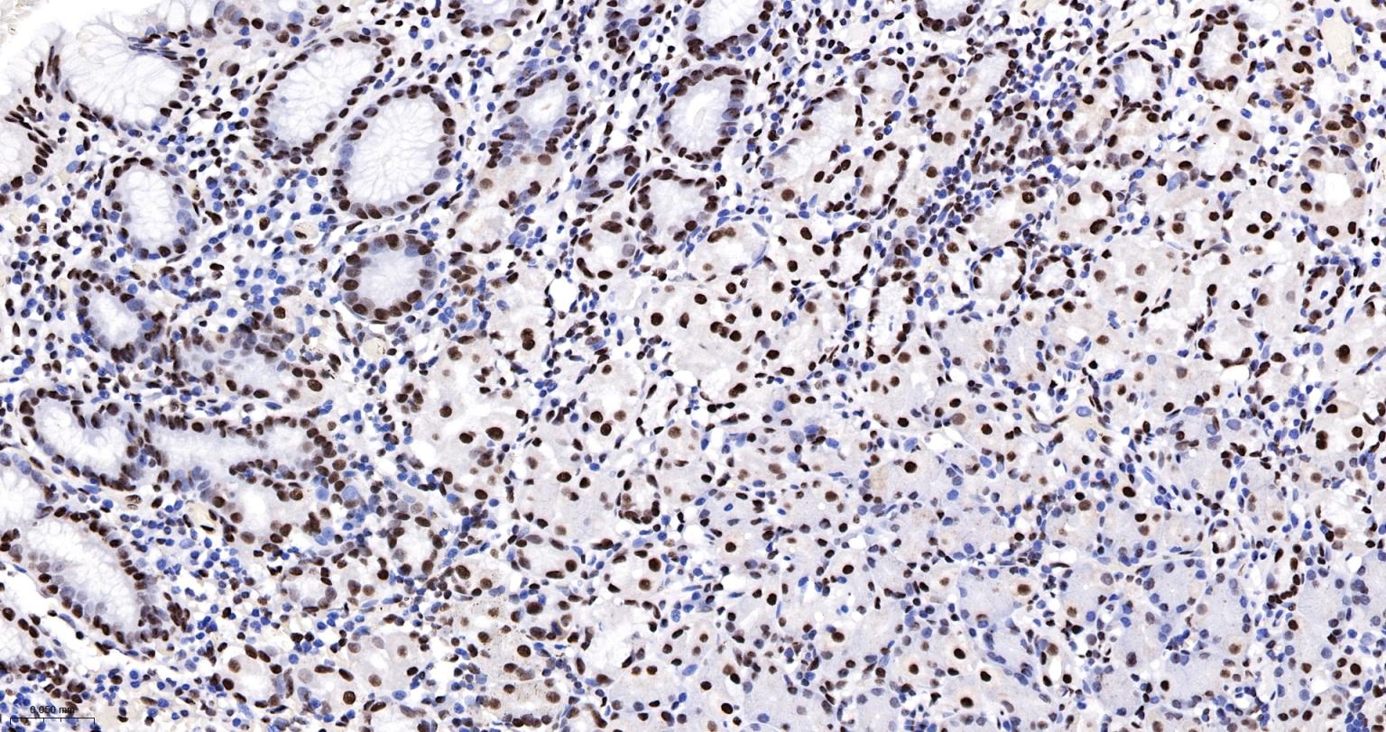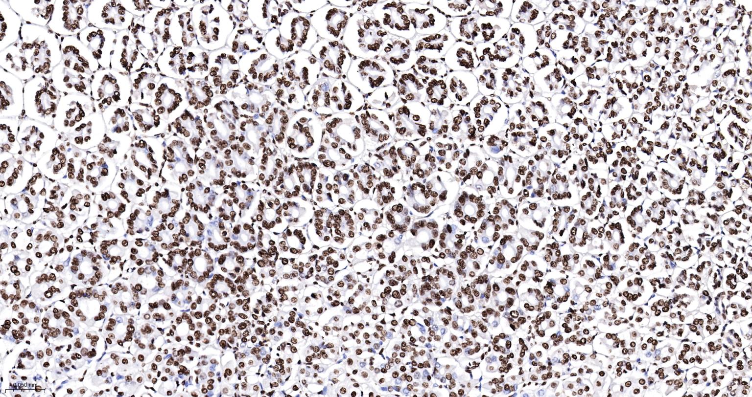 Paraformaldehyde-fixed, paraffin embedded Mouse Stomach; Antigen retrieval by boiling in sodium citrate buffer (pH6.0) for 15 min; The section was incubated with SFPQ Monoclonal Antibody, Unconjugated (bsm-61746R) at 1:200 overnight at 4°C, followed by conjugation to the bs-0295G-HRP and DAB (C-0010) staining.