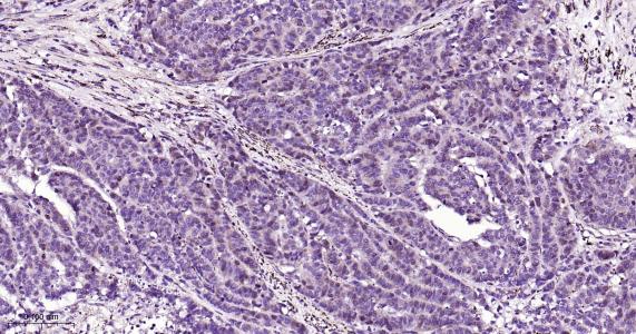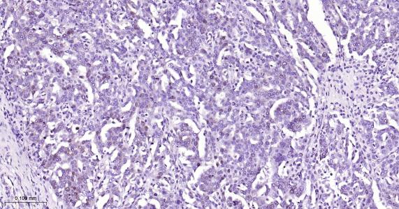 Paraformaldehyde-fixed, paraffin embedded Human Ovarian Cancer; Antigen retrieval by boiling in sodium citrate buffer (pH6.0) for 15 min; Antibody incubation Geminin Monoclonal Antibody, Unconjugated(bsm-61750R) at 1:200 overnight at 4°C, followed by conjugation to the bs-0295G-HRP and DAB (C-0010) staining.