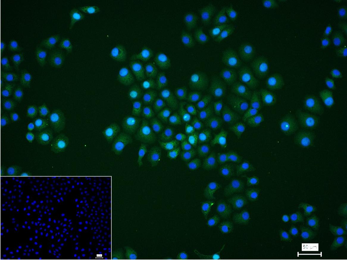 4% Paraformaldehyde-fixed HepG2 (H) cell; Triton X-100 at r.t. for 20 min; Antibody incubation with (Geminin) monoclonal Antibody, unconjugated (bsm-61750R) 1:100, 90 min at 37°C; followed by conjugated Goat Anti-Rabbit IgG antibody (green, bs-40295G-FITC) at 37°C for 90 min, DAPI (blue, C02-04002) was used to stain the cell nuclei. PBS instead of the primary antibody was used as the blank control.