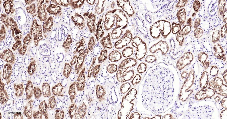 Paraformaldehyde-fixed, paraffin embedded Human Kidney; Antigen retrieval by boiling in sodium citrate buffer (pH6.0) for 15 min; Antibody incubation with NAPSIN A Monoclonal Antibody, Unconjugated(bsm-61759R) at 1:200 overnight at 4°C, followed by conjugation to the bs-0295G-HRP and DAB (C-0010) staining.