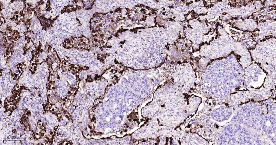 Paraformaldehyde-fixed, paraffin embedded Human Lung Cancer; Antigen retrieval by boiling in sodium citrate buffer (pH6.0) for 15 min; Antibody incubation with NAPSIN A Monoclonal Antibody, Unconjugated(bsm-61759R) at 1:200 overnight at 4°C, followed by conjugation to the bs-0295G-HRP and DAB (C-0010) staining.