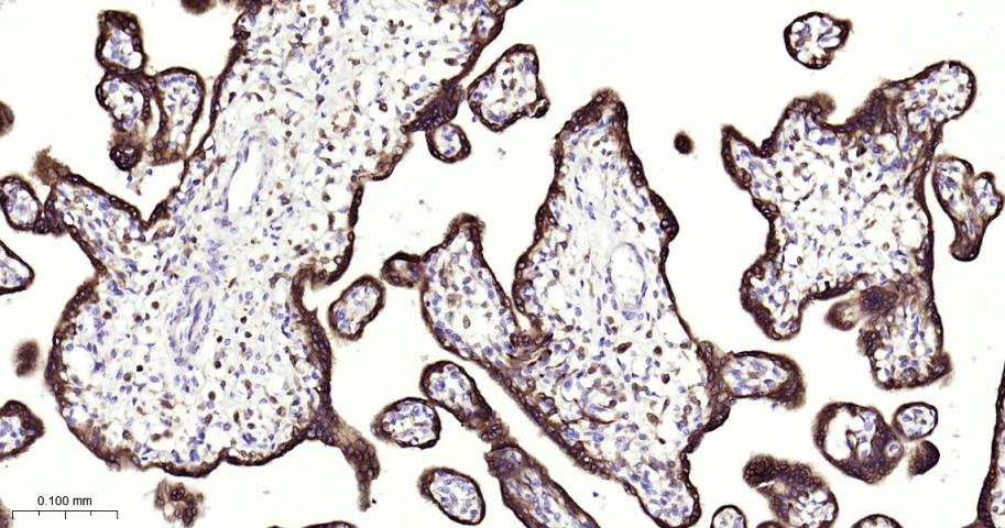 Paraformaldehyde-fixed, paraffin embedded Human Placenta; Antigen retrieval by boiling in sodium citrate buffer (pH6.0) for 15 min; Antibody incubation with IMP3 Monoclonal Antibody, Unconjugated(bsm-61766R) at 1:200 overnight at 4°C, followed by conjugation to the bs-0295G-HRP and DAB (C-0010) staining.