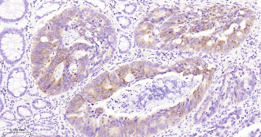 Paraformaldehyde-fixed, paraffin embedded Human Colon Cancer; Antigen retrieval by boiling in sodium citrate buffer (pH6.0) for 15 min; Antibody incubation with IMP3 Monoclonal Antibody, Unconjugated(bsm-61766R) at 1:200 overnight at 4°C, followed by conjugation to the bs-0295G-HRP and DAB (C-0010) staining.