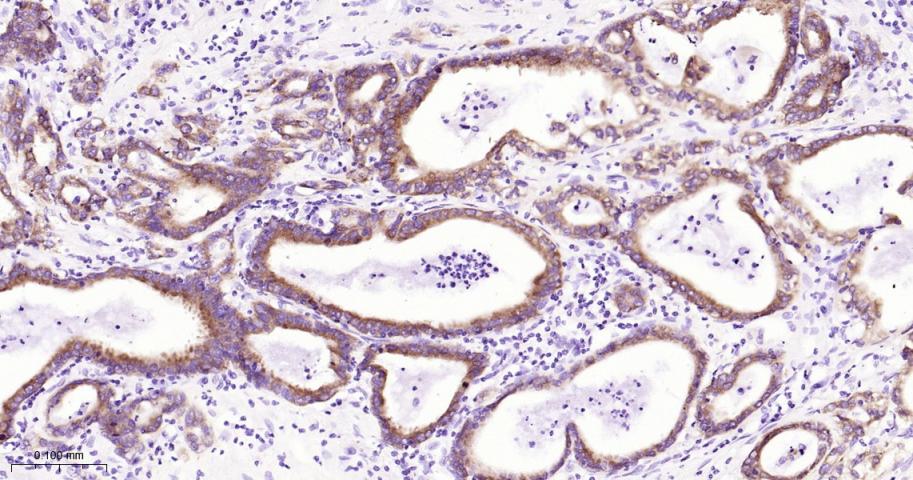 Paraformaldehyde-fixed, paraffin embedded Human Pancreatic Cancer; Antigen retrieval by boiling in sodium citrate buffer (pH6.0) for 15 min; Antibody incubation with IMP3 Monoclonal Antibody, Unconjugated(bsm-61766R) at 1:200 overnight at 4°C, followed by conjugation to the bs-0295G-HRP and DAB (C-0010) staining.