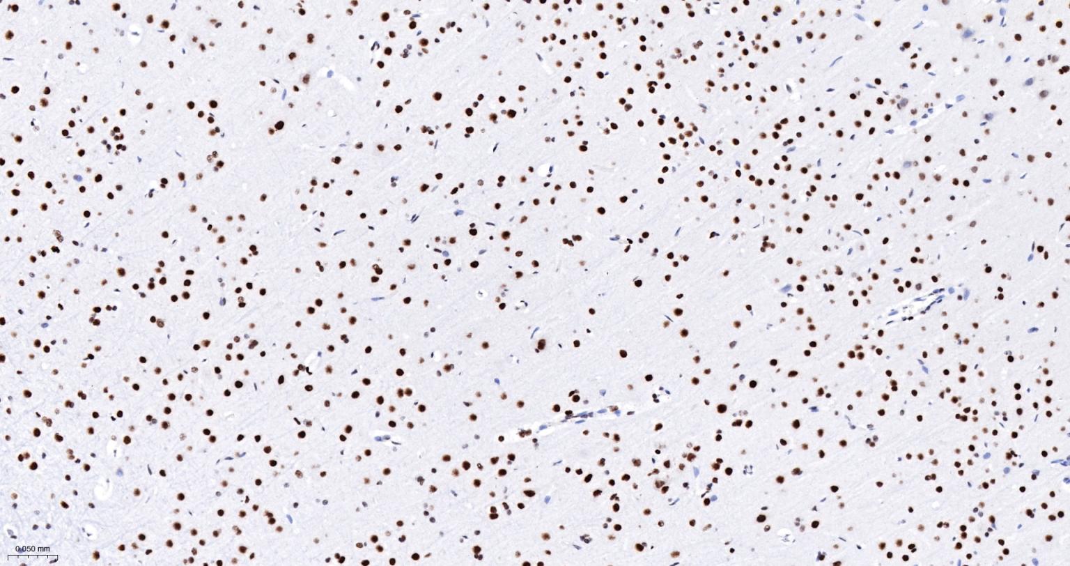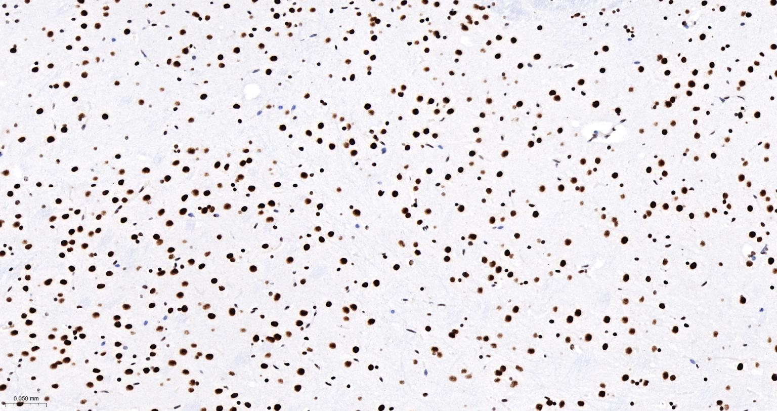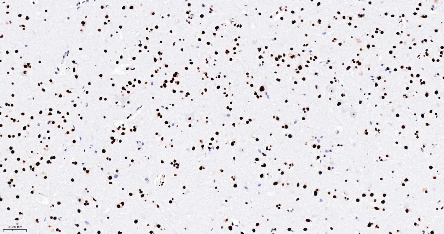 Paraformaldehyde-fixed, paraffin embedded Human Cerebrum; Antigen retrieval by boiling in sodium citrate buffer (pH6.0) for 15 min; The section was incubated with DDX9 Monoclonal Antibody, Unconjugated (bsm-61787R) at 1:200 overnight at 4°C, followed by conjugation to the bs-0295G-HRP and DAB (C-0010) staining.