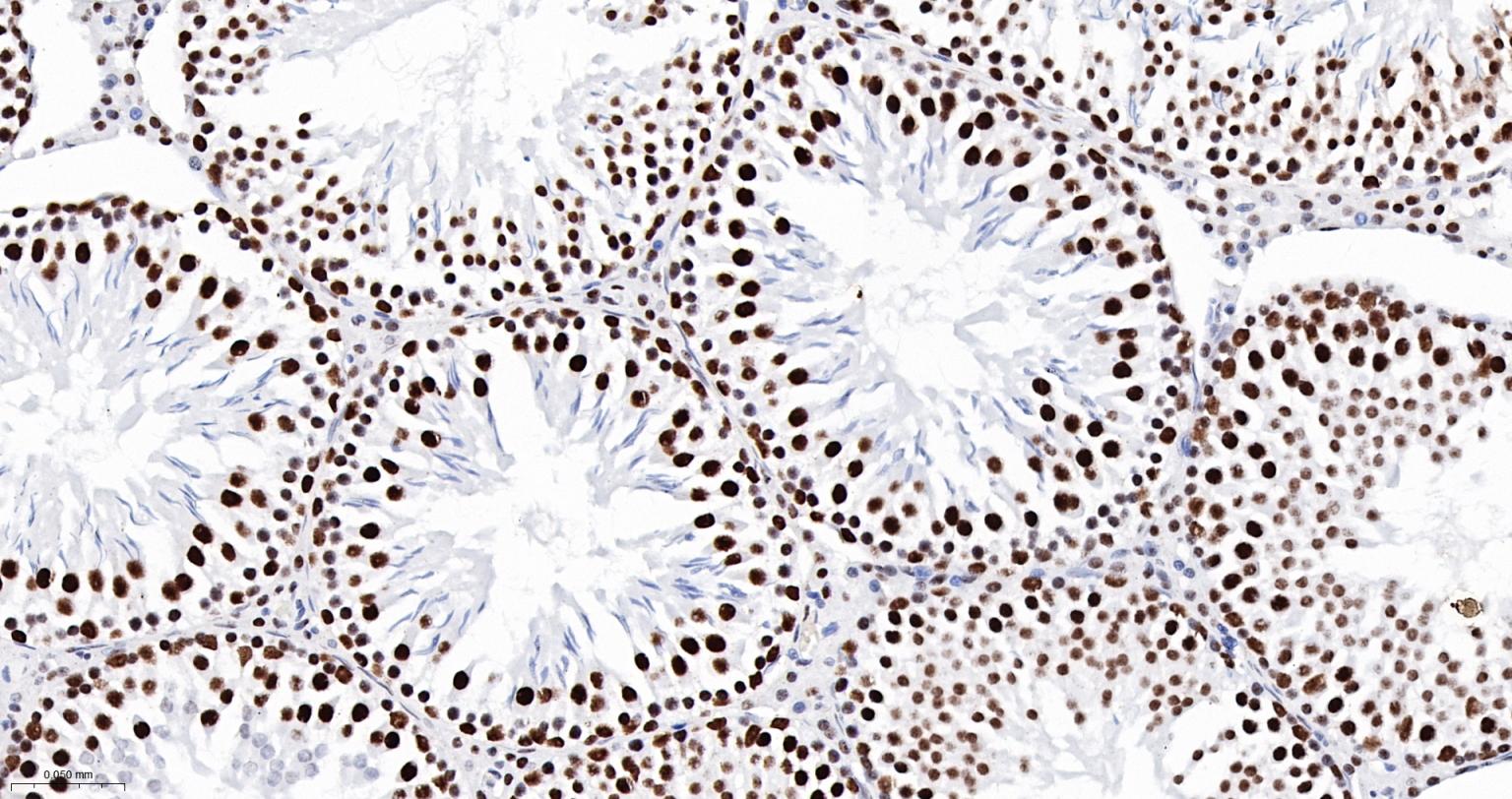 Paraformaldehyde-fixed, paraffin embedded Mouse Testicles; Antigen retrieval by boiling in sodium citrate buffer (pH6.0) for 15 min; The section was incubated with DDX9 Monoclonal Antibody, Unconjugated (bsm-61787R) at 1:200 overnight at 4°C, followed by conjugation to the bs-0295G-HRP and DAB (C-0010) staining.