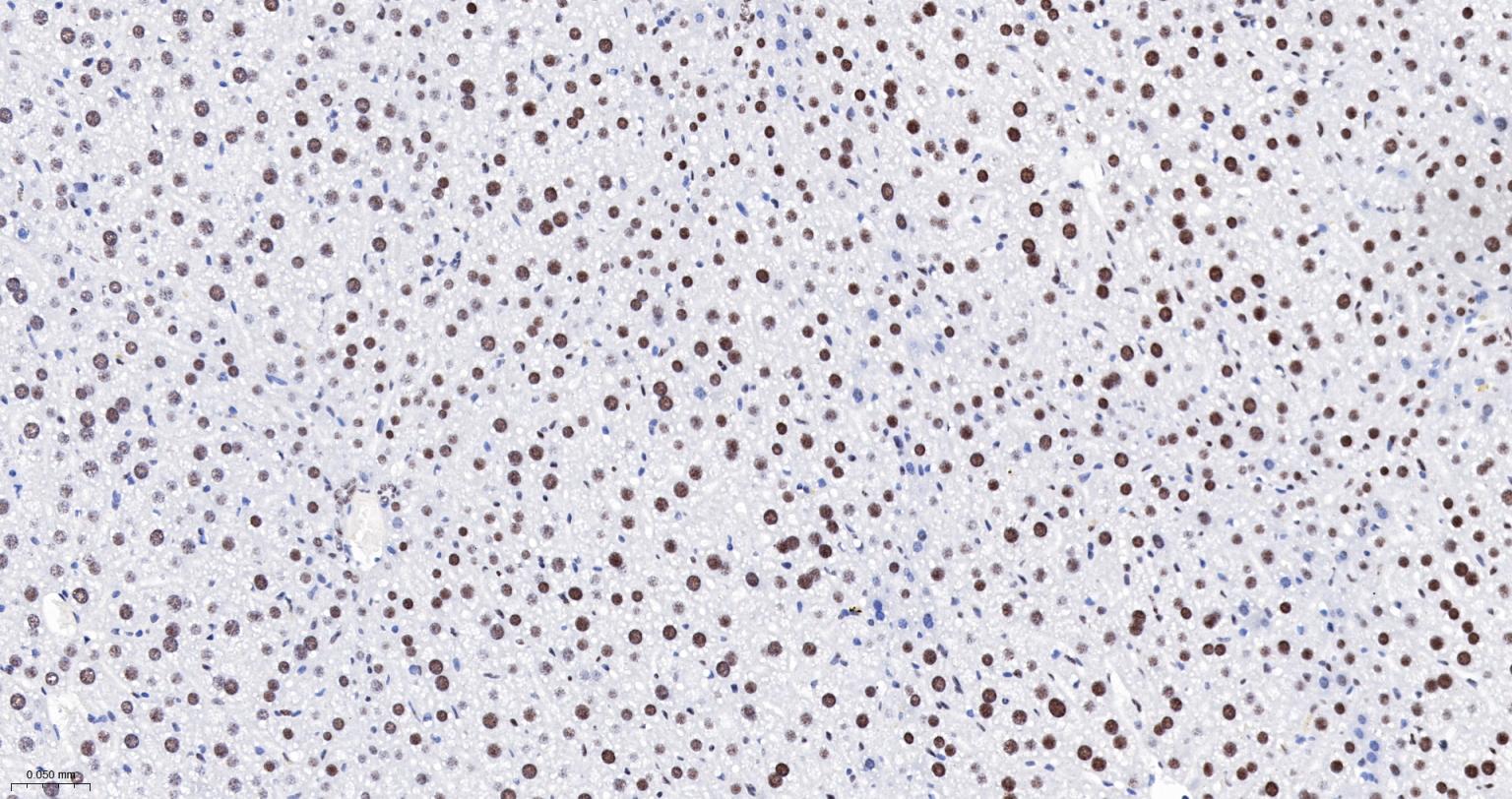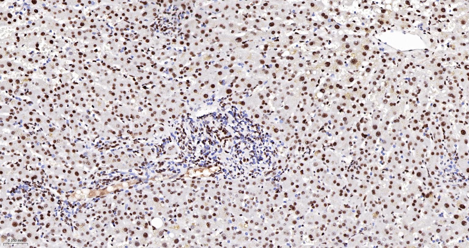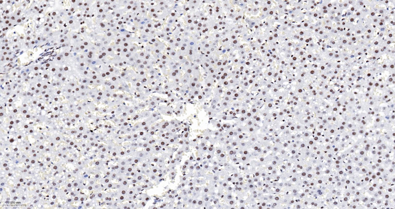 Paraformaldehyde-fixed, paraffin embedded Rat Liver; Antigen retrieval by boiling in sodium citrate buffer (pH6.0) for 15 min; The section was incubated with DDX9 Monoclonal Antibody, Unconjugated (bsm-61787R) at 1:200 overnight at 4°C, followed by conjugation to the bs-0295G-HRP and DAB (C-0010) staining.
