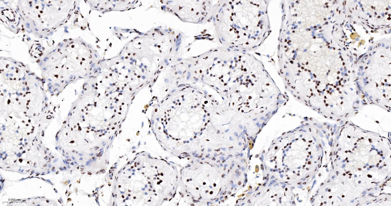 Paraformaldehyde-fixed, paraffin embedded Human Testicles; Antigen retrieval by boiling in sodium citrate buffer (pH6.0) for 15 min; The section was incubated with DDX9 Monoclonal Antibody, Unconjugated (bsm-61787R) at 1:200 overnight at 4°C, followed by conjugation to the bs-0295G-HRP and DAB (C-0010) staining.