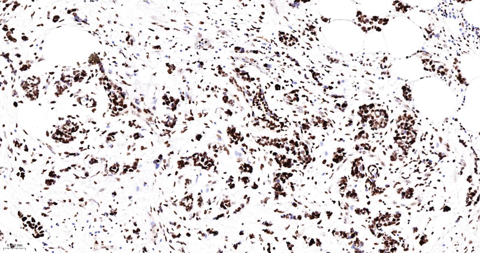 Paraformaldehyde-fixed, paraffin embedded Human Breast Cancer; Antigen retrieval by boiling in sodium citrate buffer (pH6.0) for 15 min; The section was incubated with DDX9 Monoclonal Antibody, Unconjugated (bsm-61787R) at 1:200 overnight at 4°C, followed by conjugation to the bs-0295G-HRP and DAB (C-0010) staining.