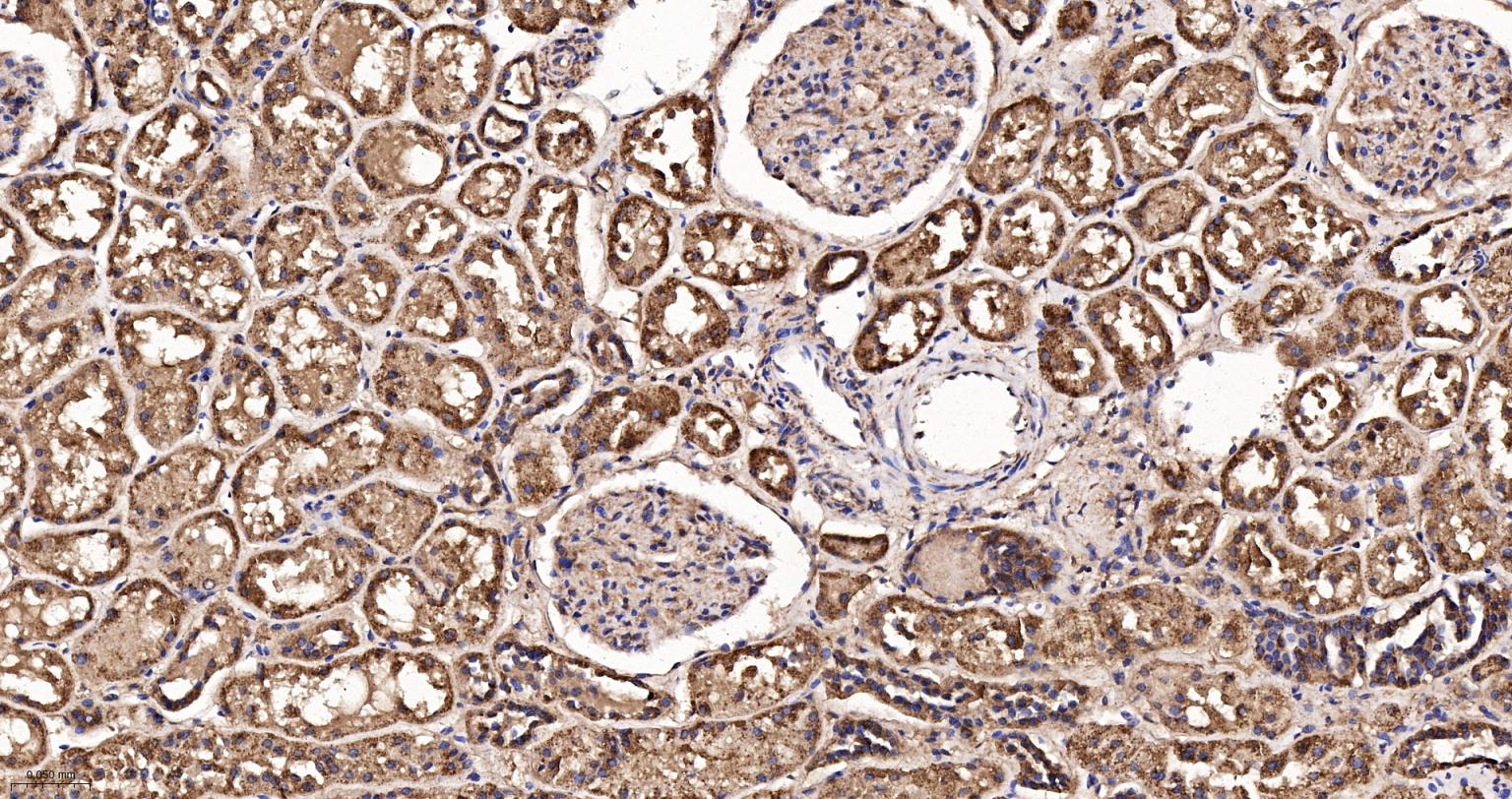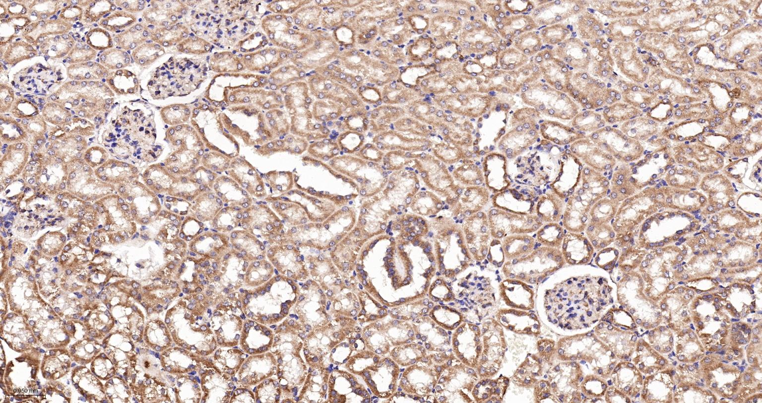 Paraformaldehyde-fixed, paraffin embedded Rat Kidney; Antigen retrieval by boiling in sodium citrate buffer (pH6.0) for 15 min; The section was incubated with Thioredoxin 2 Monoclonal Antibody, Unconjugated (bsm-61794R) at 1:200 overnight at 4°C, followed by conjugation to the bs-0295G-HRP and DAB (C-0010) staining.