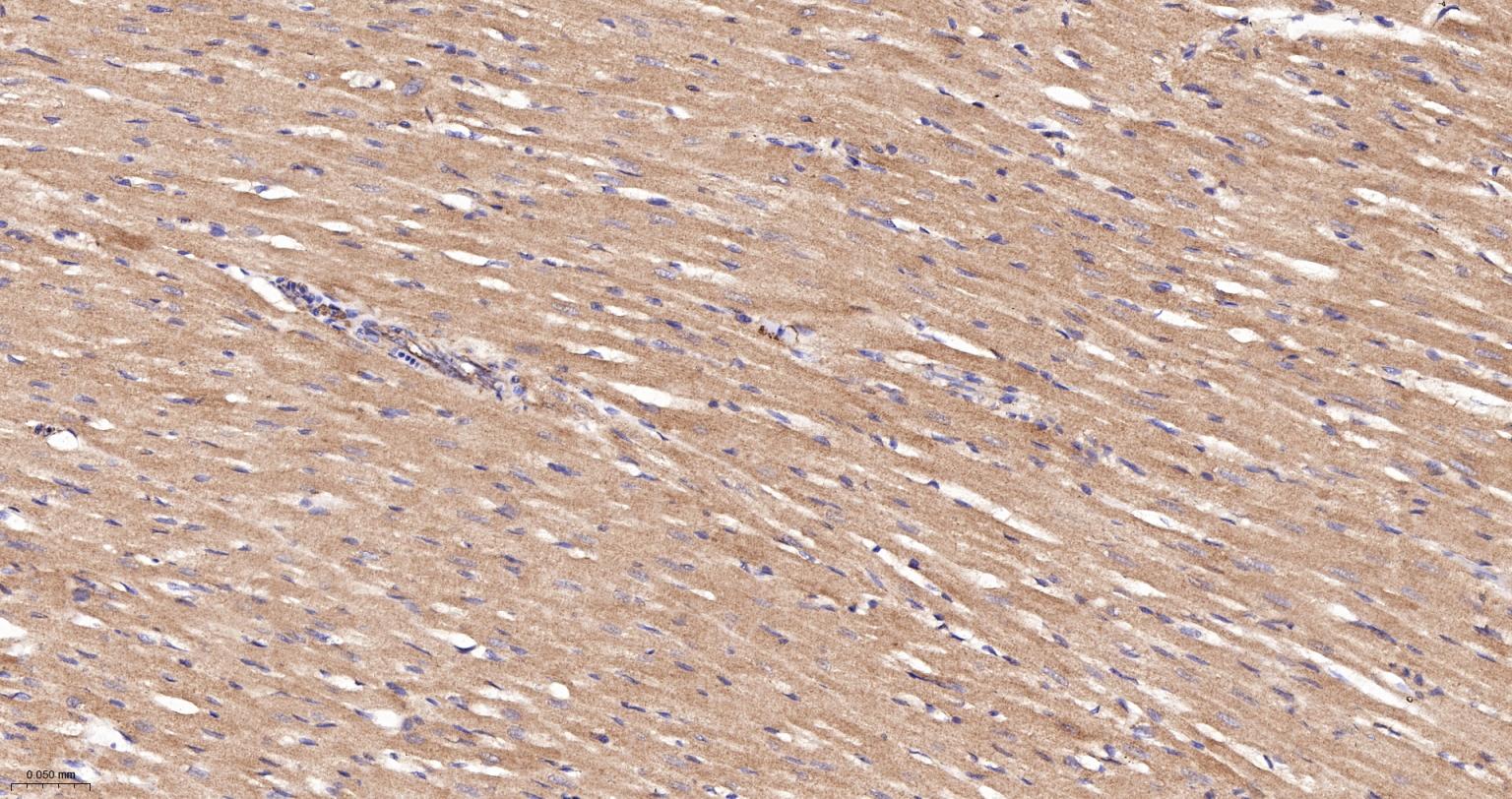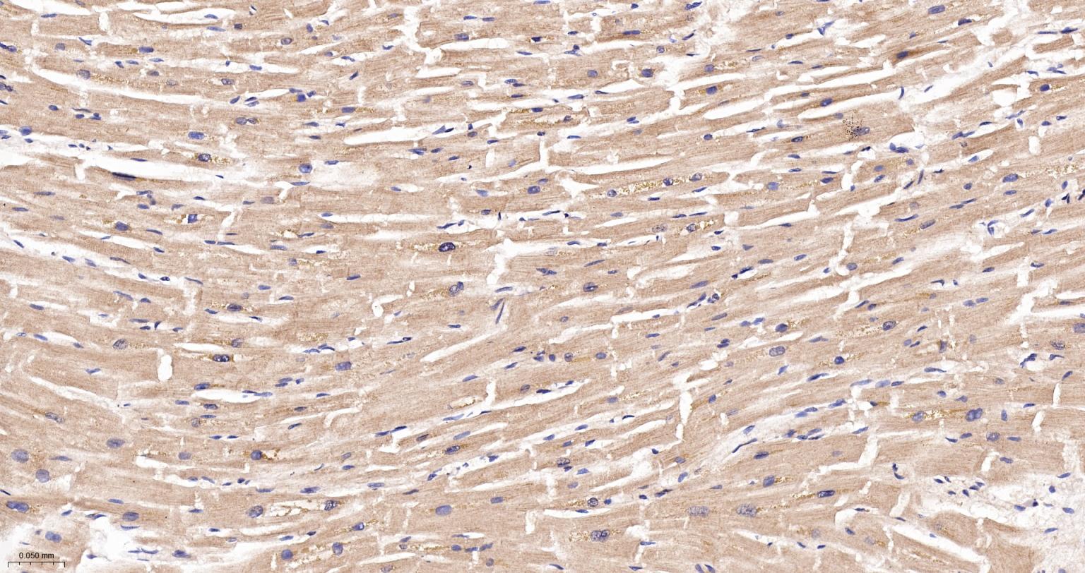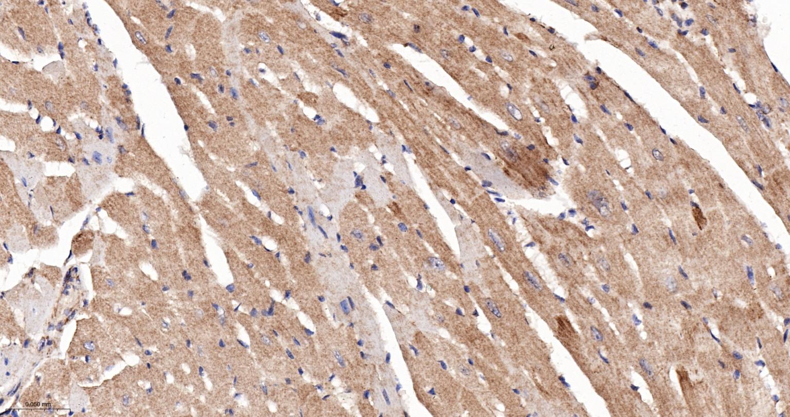 Paraformaldehyde-fixed, paraffin embedded Rat Heart; Antigen retrieval by boiling in sodium citrate buffer (pH6.0) for 15 min; The section was incubated with Thioredoxin 2 Monoclonal Antibody, Unconjugated (bsm-61794R) at 1:200 overnight at 4°C, followed by conjugation to the bs-0295G-HRP and DAB (C-0010) staining.