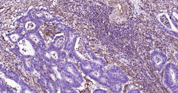 Paraformaldehyde-fixed, paraffin embedded Human Colon Cancer; Antigen retrieval by boiling in sodium citrate buffer (pH6.0) for 15 min; Antibody incubation with CRMP2 Monoclonal Antibody, Unconjugated(bsm-61800R) at 1:200 overnight at 4°C, followed by conjugation to the bs-0295G-HRP and DAB (C-0010) staining.