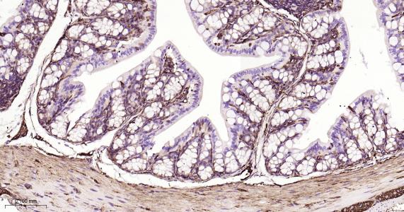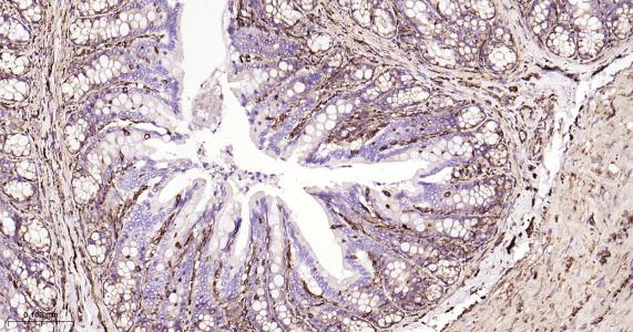 Paraformaldehyde-fixed, paraffin embedded Mouse Colon; Antigen retrieval by boiling in sodium citrate buffer (pH6.0) for 15 min; Antibody incubation with CRMP2 Monoclonal Antibody, Unconjugated(bsm-61800R) at 1:200 overnight at 4°C, followed by conjugation to the bs-0295G-HRP and DAB (C-0010) staining.