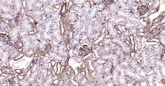 Paraformaldehyde-fixed, paraffin embedded Mouse Kidney; Antigen retrieval by boiling in sodium citrate buffer (pH6.0) for 15 min; Antibody incubation with CRMP2 Monoclonal Antibody, Unconjugated(bsm-61800R) at 1:200 overnight at 4°C, followed by conjugation to the bs-0295G-HRP and DAB (C-0010) staining.