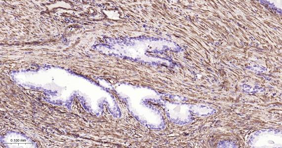 Paraformaldehyde-fixed, paraffin embedded Mouse Prostate; Antigen retrieval by boiling in sodium citrate buffer (pH6.0) for 15 min; Antibody incubation with CRMP2 Monoclonal Antibody, Unconjugated(bsm-61800R) at 1:200 overnight at 4°C, followed by conjugation to the bs-0295G-HRP and DAB (C-0010) staining.