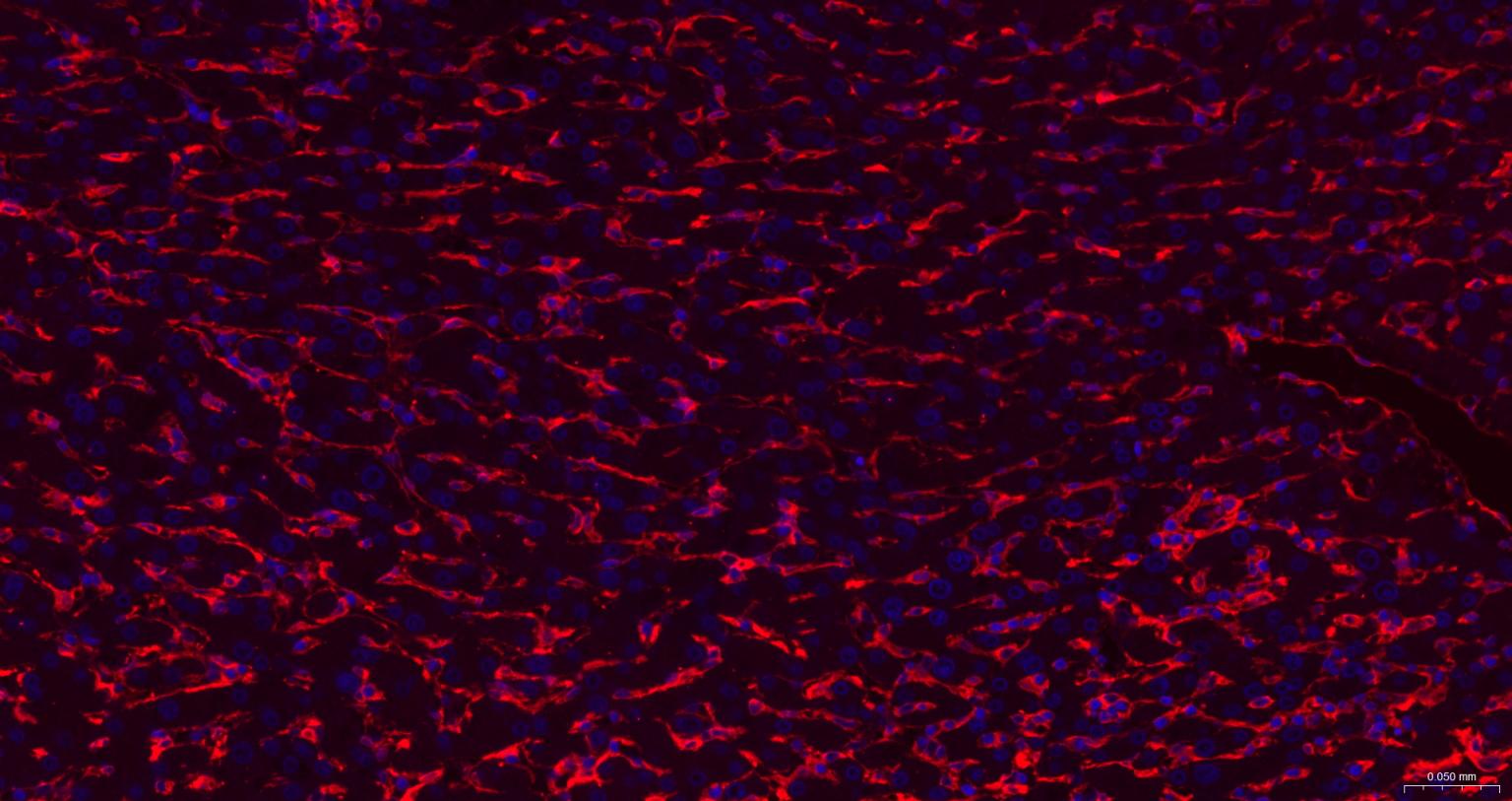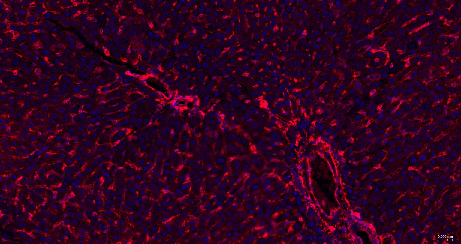 Paraformaldehyde-fixed, paraffin embedded Mouse Liver; Antigen retrieval by boiling in sodium citrate buffer (pH6.0) for 15 min; The section was incubated with CRMP2 Monoclonal Antibody, Unconjugated (bsm-61800R) at 1:200 overnight at 4°C. Followed by conjugated Goat Anti-Rabbit IgG antibody (Red, bs-0295G-BF594), DAPI (blue, C02-04002) was used to stain the cell nuclei.