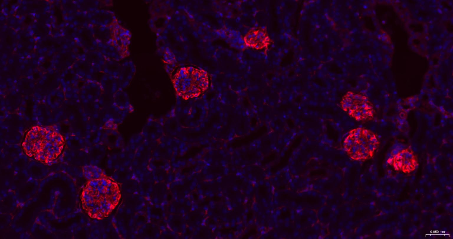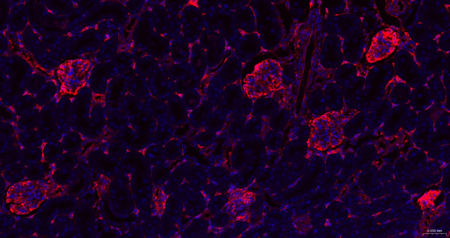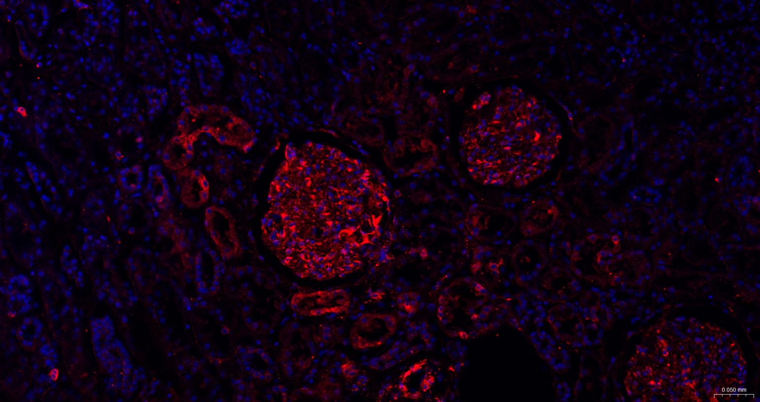 Paraformaldehyde-fixed, paraffin embedded Mouse Kidney; Antigen retrieval by boiling in sodium citrate buffer (pH6.0) for 15 min; The section was incubated with CRMP2 Monoclonal Antibody, Unconjugated (bsm-61800R) at 1:200 overnight at 4°C. Followed by conjugated Goat Anti-Rabbit IgG antibody (Red, bs-0295G-BF594), DAPI (blue, C02-04002) was used to stain the cell nuclei.