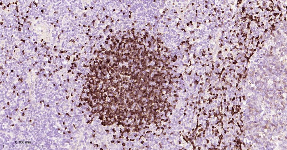 Paraformaldehyde-fixed, paraffin embedded Human Spleen; Antigen retrieval by boiling in sodium citrate buffer (pH6.0) for 15 min; Antibody incubation with TCL1A Monoclonal Antibody, Unconjugated(bsm-61801R) at 1:200 overnight at 4°C, followed by conjugation to the bs-0295G-HRP and DAB (C-0010) staining.