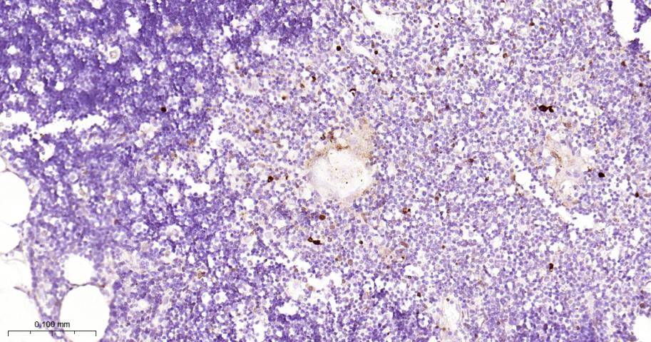 Paraformaldehyde-fixed, paraffin embedded Human Lymph; Antigen retrieval by boiling in sodium citrate buffer (pH6.0) for 15 min; Antibody incubation with TCL1A Monoclonal Antibody, Unconjugated(bsm-61801R) at 1:200 overnight at 4°C, followed by conjugation to the bs-0295G-HRP and DAB (C-0010) staining.