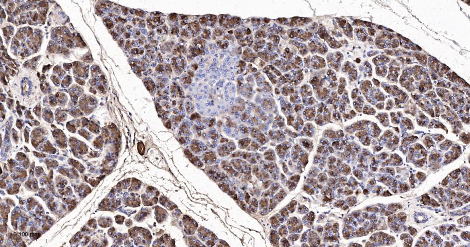 Paraformaldehyde-fixed, paraffin embedded Human Pancreas; Antigen retrieval by boiling in sodium citrate buffer (pH6.0) for 15 min; The section was incubated with Pancreatic lipase Monoclonal Antibody, Unconjugated (bsm-61805R) at 1:200 overnight at 4°C, followed by conjugation to the bs-0295G-HRP and DAB (C-0010) staining.