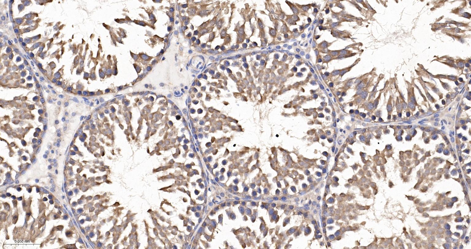 Paraformaldehyde-fixed, paraffin embedded Rat Testicles; Antigen retrieval by boiling in sodium citrate buffer (pH6.0) for 15 min; The section was incubated with eIF1AX Monoclonal Antibody, Unconjugated (bsm-61809R) at 1:200 overnight at 4°C, followed by conjugation to the bs-0295G-HRP and DAB (C-0010) staining.