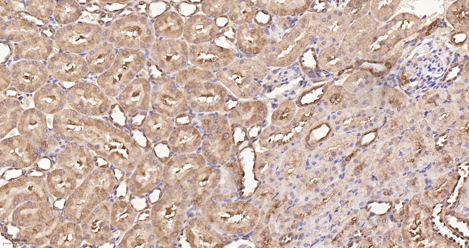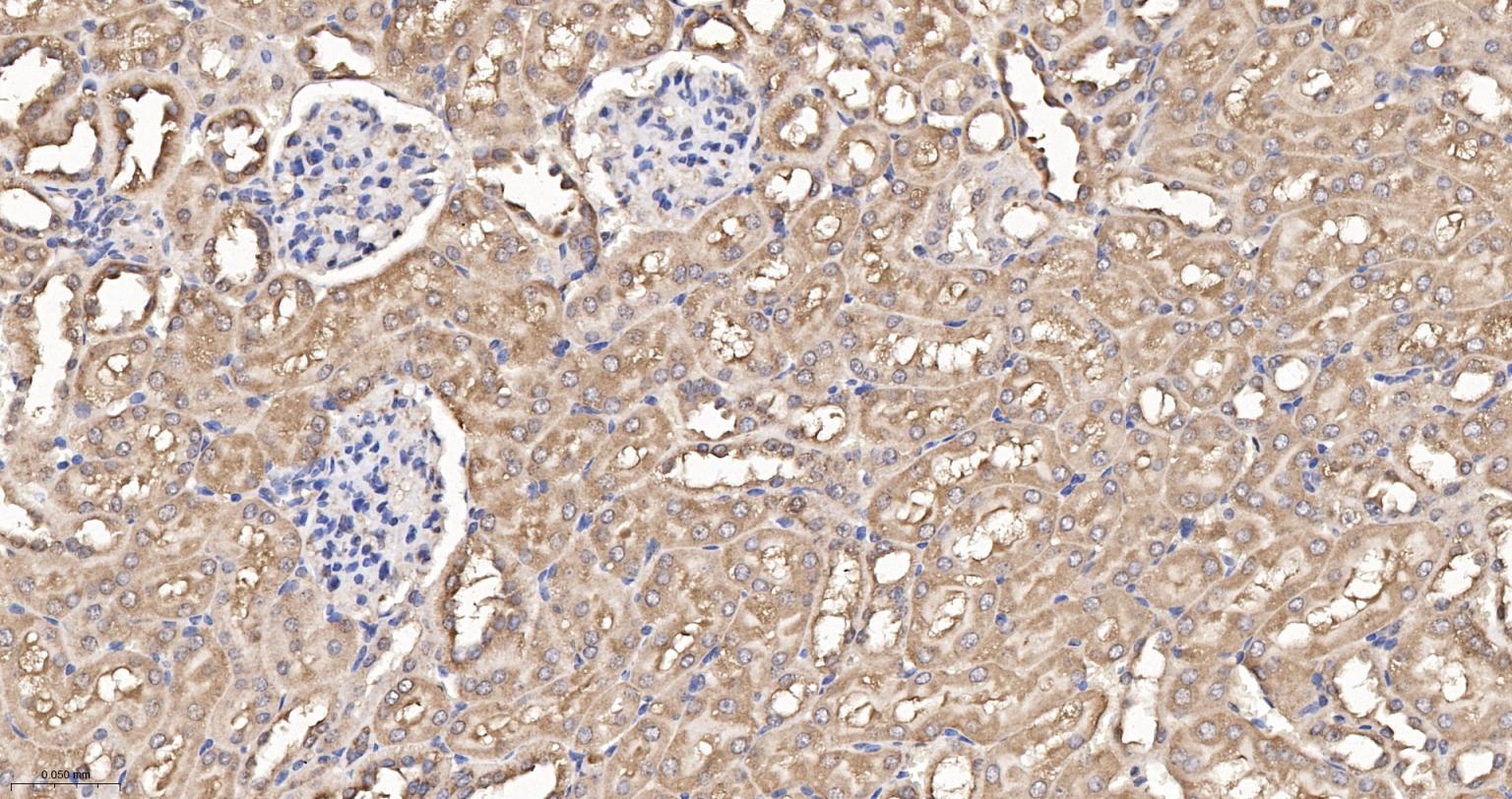 Paraformaldehyde-fixed, paraffin embedded Rat Kidney; Antigen retrieval by boiling in sodium citrate buffer (pH6.0) for 15 min; The section was incubated with eIF1AX Monoclonal Antibody, Unconjugated (bsm-61809R) at 1:200 overnight at 4°C, followed by conjugation to the bs-0295G-HRP and DAB (C-0010) staining.