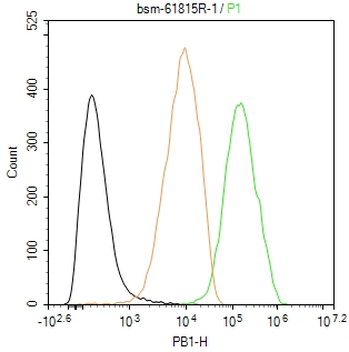 The MCF-7 (H) cells were fixed with 4% PFA (10 min at r.t.) and then permeabilized with 90% ice-cold methanol for 20 min at -20℃,the cells then were incubated in 5%BSA to block non-specific protein-protein interactions (30 min at r.t.), followed by secondary antibody incubation for 40 min at room temperature. Primary Antibody (green):Rabbit Anti-PB1 antibody (bsm-61815R,1:100); Isotype Control (orange): Rabbit IgG (bs-0295P). Blank control (black): PBS. Acquisition of 20,000 events was performed.