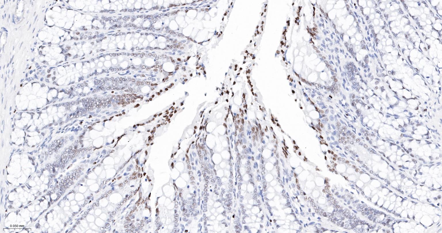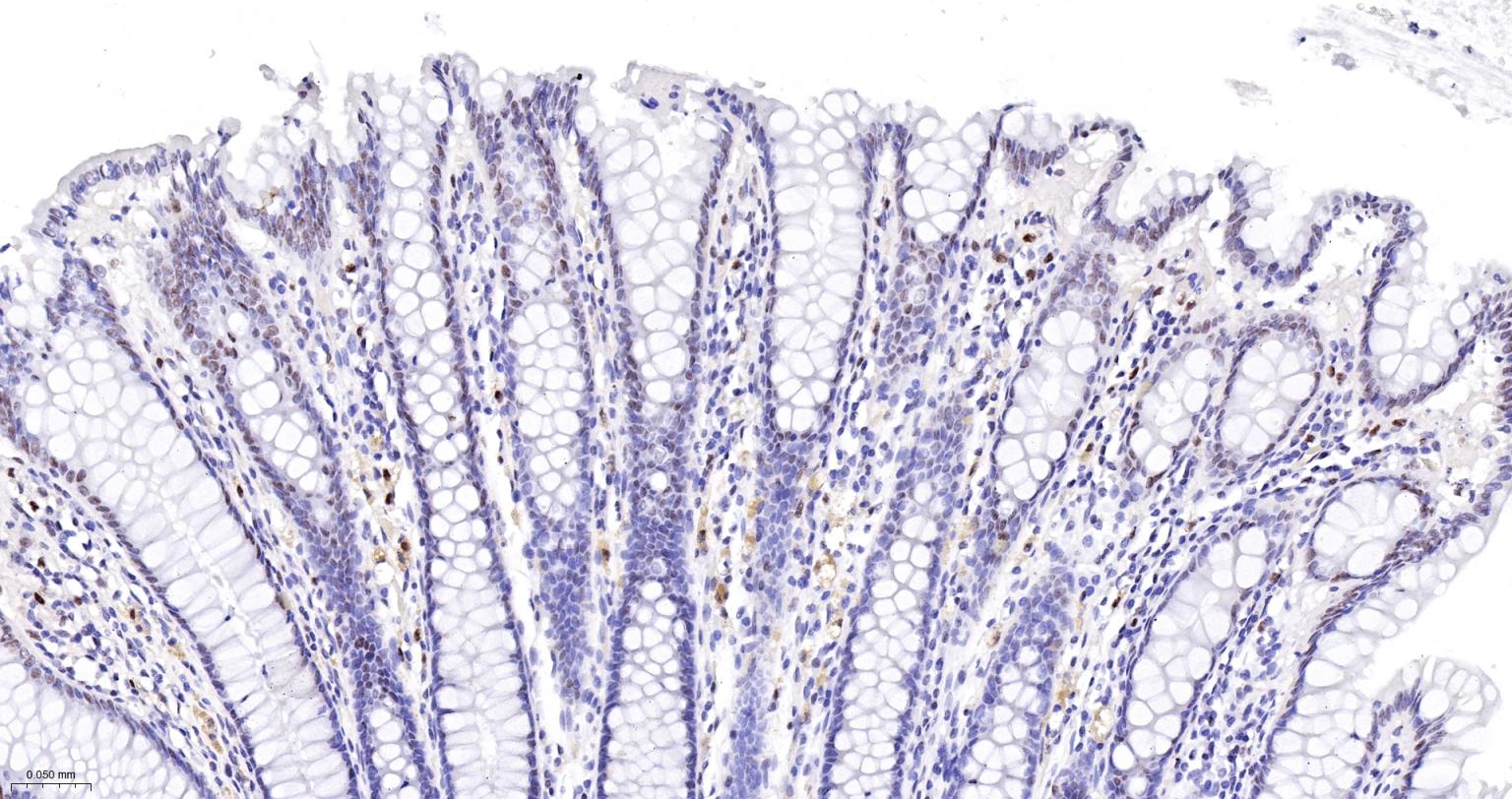 Paraformaldehyde-fixed, paraffin embedded Mouse Colon; Antigen retrieval by boiling in sodium citrate buffer (pH6.0) for 15 min; The section was incubated with PB1 Monoclonal Antibody, Unconjugated (bsm-61815R) at 1:200 overnight at 4°C, followed by conjugation to the bs-0295G-HRP and DAB (C-0010) staining.
