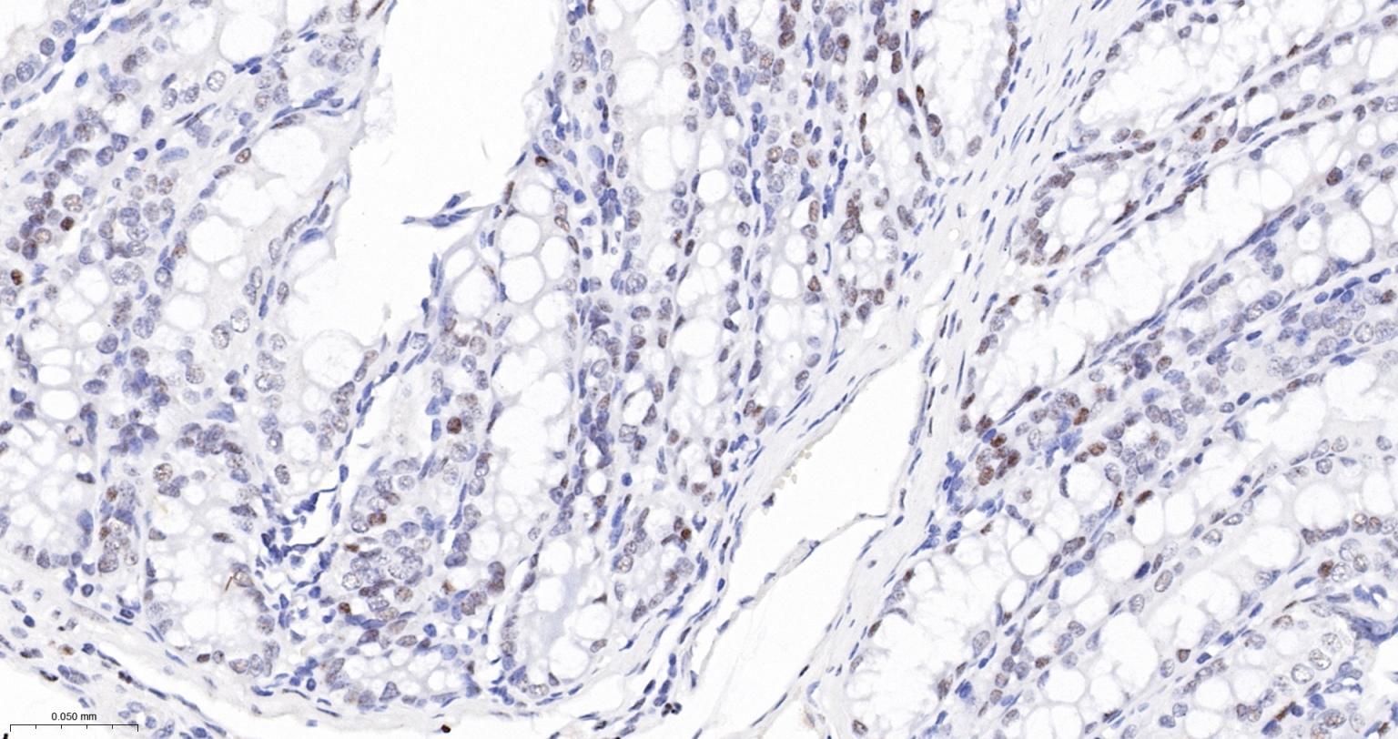Paraformaldehyde-fixed, paraffin embedded Human Colon; Antigen retrieval by boiling in sodium citrate buffer (pH6.0) for 15 min; The section was incubated with PB1 Monoclonal Antibody, Unconjugated (bsm-61815R) at 1:200 overnight at 4°C, followed by conjugation to the bs-0295G-HRP and DAB (C-0010) staining.