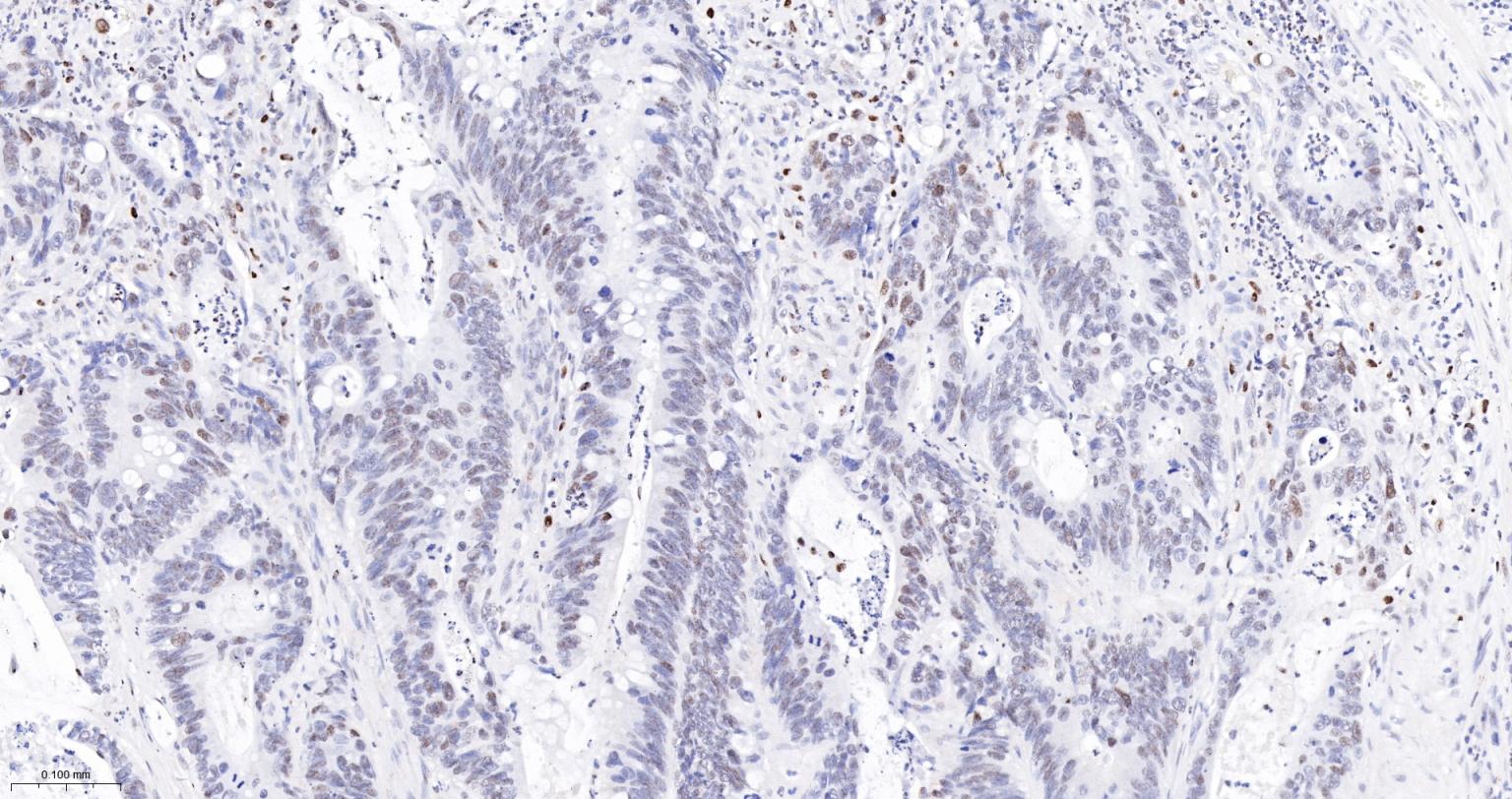 Paraformaldehyde-fixed, paraffin embedded Human Colon Cancer; Antigen retrieval by boiling in sodium citrate buffer (pH6.0) for 15 min; The section was incubated with PB1 Monoclonal Antibody, Unconjugated (bsm-61815R) at 1:200 overnight at 4°C, followed by conjugation to the bs-0295G-HRP and DAB (C-0010) staining.