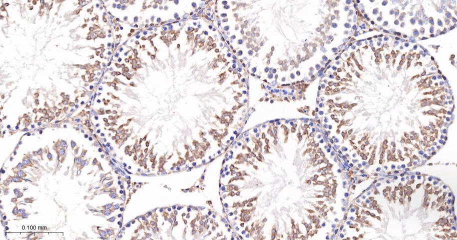 Paraformaldehyde-fixed, paraffin embedded Rat Testicles; Antigen retrieval by boiling in sodium citrate buffer (pH6.0) for 15 min; The section was incubated with FDFT1 Monoclonal Antibody, Unconjugated (bsm-61816R) at 1:200 overnight at 4°C, followed by conjugation to the bs-0295G-HRP and DAB (C-0010) staining.