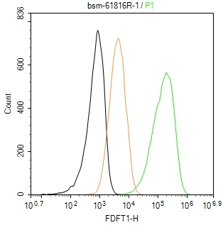 The HepG2 (H) cells were fixed with 4% PFA (10 min at r.t.) and then permeabilized with 90% ice-cold methanol for 20 min at -20℃,the cells then were incubated in 5%BSA to block non-specific protein-protein interactions (30 min at r.t.), followed by secondary antibody incubation for 40 min at room temperature. Primary Antibody (green):Rabbit Anti-FDFT1 antibody (bsm-61816R,1:100); Isotype Control (orange): Rabbit IgG (bs-0295P). Blank control (black): PBS. Acquisition of 20,000 events was performed.