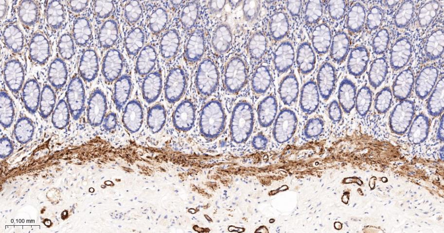 Paraformaldehyde-fixed, paraffin embedded Mouse Colon; Antigen retrieval by boiling in sodium citrate buffer (pH6.0) for 15 min; The section was incubated with SM22 Monoclonal Antibody, Unconjugated (bsm-61818R) at 1:200 overnight at 4°C, followed by conjugation to the bs-0295G-HRP and DAB (C-0010) staining.