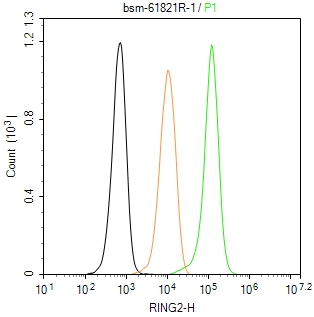 The Hela (H) cells were fixed with 4% PFA (10 min at r.t.) and then permeabilized with 90% ice-cold methanol for 20 min at -20℃,the cells then were incubated in 5%BSA to block non-specific protein-protein interactions (30 min at r.t.), followed by secondary antibody incubation for 40 min at room temperature. Primary Antibody (green):Rabbit Anti-RING2 antibody (bsm-61821R,1:100); Isotype Control (orange): Rabbit IgG (bs-0295P). Blank control (black): PBS. Acquisition of 20,000 events was performed.