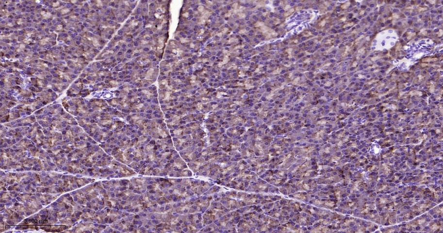 Paraformaldehyde-fixed, paraffin embedded Mouse Pancreas; Antigen retrieval by boiling in sodium citrate buffer (pH6.0) for 15 min; The section was incubated with Peroxiredoxin-4 Monoclonal Antibody, Unconjugated (bsm-61828R) at 1:200 overnight at 4°C, followed by conjugation to the bs-0295G-HRP and DAB (C-0010) staining.